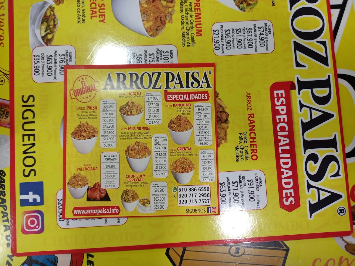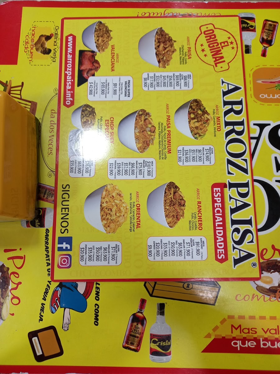 Arroz Paisa El Original Villamaría is a true gem nestled in Villamaría, Caldas, serving authentic Colombian flavors that honor the rich culinary heritage of the Paisa region. The menu shines with hearty, well-crafted dishes like the Combo Exprés, featuring arroz con pollo, pernil, chicharrón, maduros, maicitos, and a refreshing soda—all customizable in size for a perfect balance of taste and portion. Their perfectly fried pollo, whether whole or half, stands out for its crispy skin and juicy meat, embodying traditional cooking techniques with a modern twist.